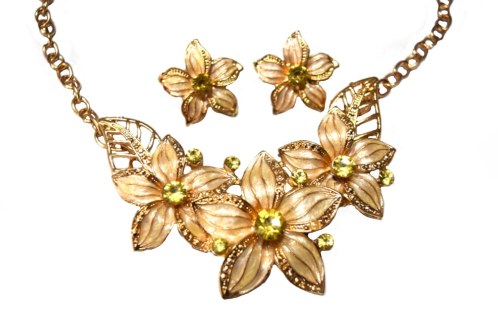 Flower Necklace And Earring Set Cream Color And Gold Flower With Peridot Crystal Anti Tarnish J 0011 Walmart Com