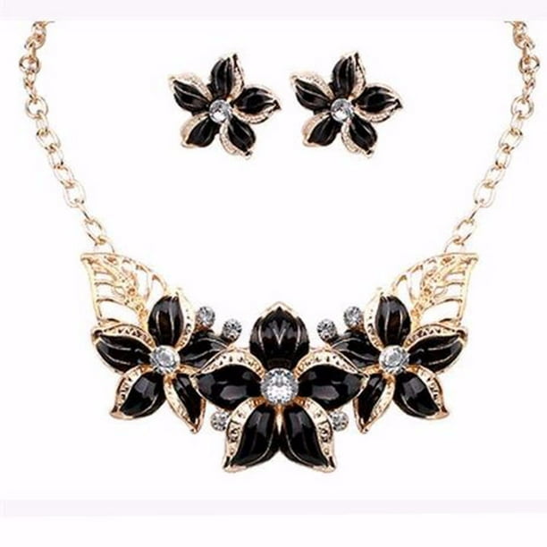 Flower Necklace And Earring Set Black And Gold Flower With Crystal Tarnish Resistant J 10 Walmart Com